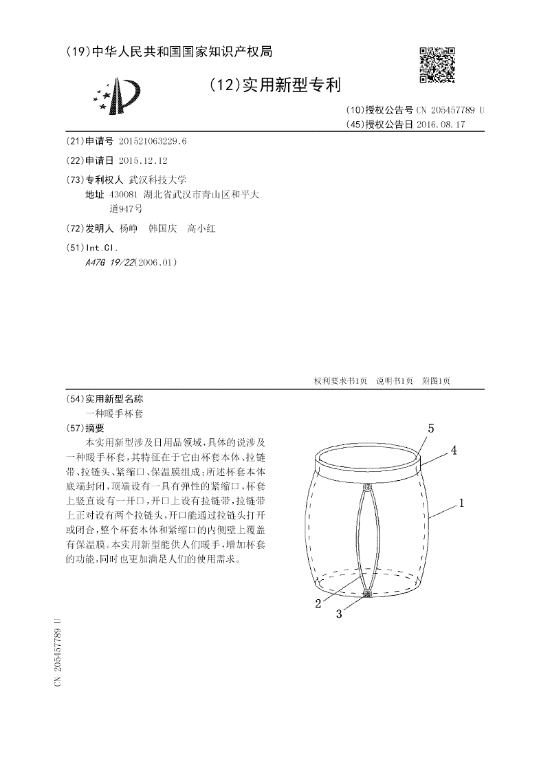本实用新型涉及日用品领域,具体的说涉及一种暖手杯套,其特征在于它由杯套本体、拉链带、拉链头、紧缩口、保温膜组成;所述杯套本体底端封闭,顶端设有一具有弹性的紧缩口,杯套上竖直设有一开口,开口上设有拉链带,拉链带上正对设有两个拉链头,开口能通过拉链头打开或闭合,整个杯套本体和紧缩口的内侧壁上覆盖有保温膜。本实用新型能供人们暖手,增加杯套的功能,同时也更加满足人们的使用需求。