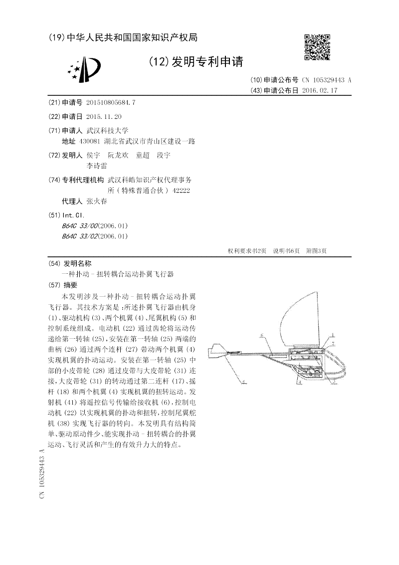 本发明涉及一种扑动-扭转耦合运动扑翼飞行器。其技术方案是:所述扑翼飞行器由机身(1)、驱动机构(3)、两个机翼(4)、尾翼机构(5)和控制系统组成。电动机(22)通过齿轮将运动传递给第一转轴(25),安装在第一转轴(25)两端的曲柄(26)通过两个连杆(27)带动两个机翼(4)实现机翼的扑动运动。安装在第一转轴(25)中部的小皮带轮(28)通过皮带与大皮带轮(31)连接,大皮带轮(31)的转动通过第二连杆(17)、摇杆(18)和两个机翼(4)实现机翼的扭转运动。发射机(41)将遥控信号传输给接收机(6),控制电动机(22)以实现机翼的扑动和扭转,控制尾翼舵机(38)实现飞行器的转向。本发明具有结构简单、驱动原动件少、能实现扑动-扭转耦合的扑翼运动、飞行灵活和产生的有效升力大的特点。