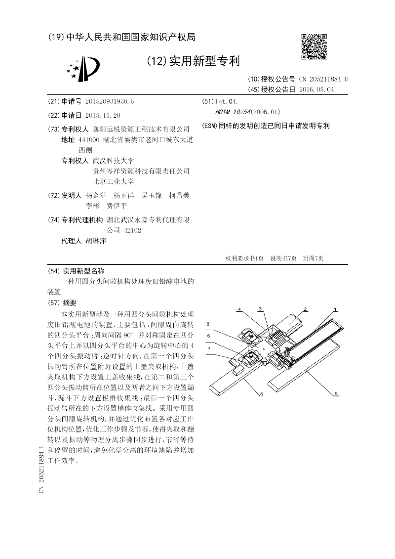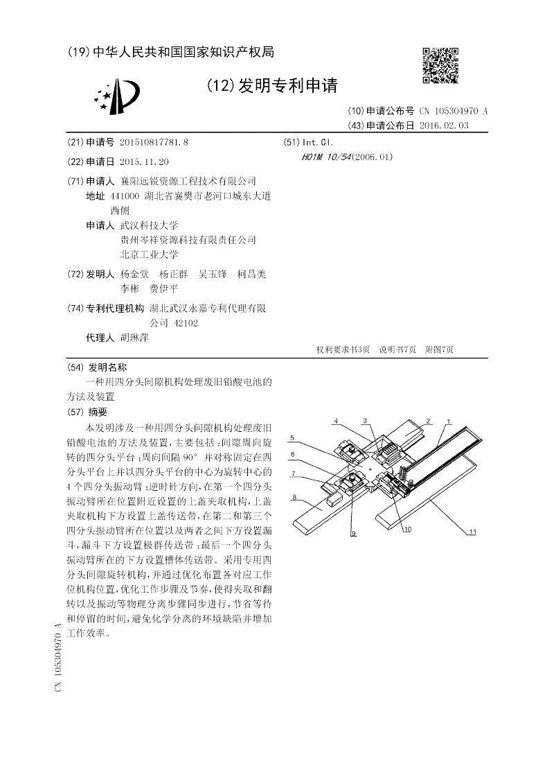 本实用新型涉及一种用四分头间隙机构处理废旧铅酸电池的装置,主要包括:间隙周向旋转的四分头平台;周向间隔90°并对称固定在四分头平台上并以四分头平台的中心为旋转中心的4个四分头振动臂;逆时针方向,在第一个四分头振动臂所在位置附近设置的上盖夹取机构,上盖夹取机构下方设置上盖收集线,在第二和第三个四分头振动臂所在位置以及两者之间下方设置漏斗,漏斗下方设置极群收集线;最后一个四分头振动臂所在的下方设置槽体收集线。采用专用四分头间隙旋转机构,并通过优化布置各对应工作位机构位置,优化工作步骤及节奏,使得夹取和翻转以及振动等物理分离步骤同步进行,节省等待和停留的时间,避免化学分离的环境缺陷并增加工作效率。