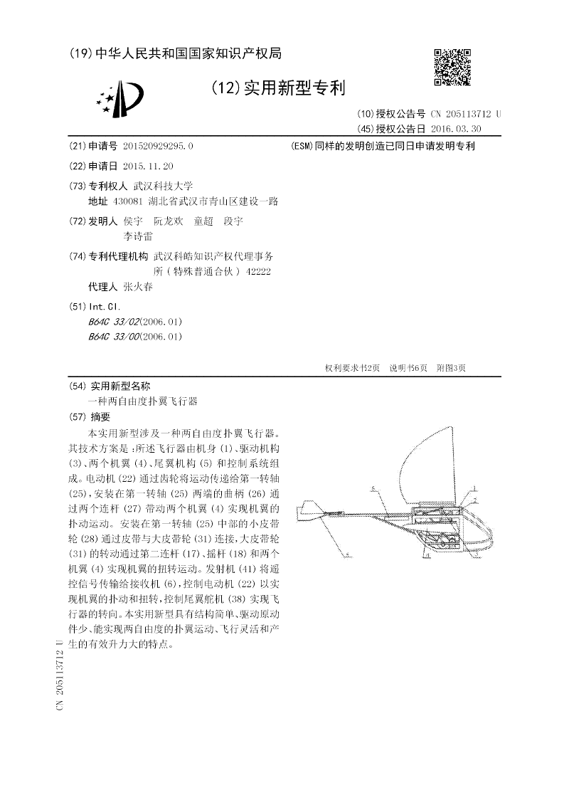本实用新型涉及一种两自由度扑翼飞行器。其技术方案是:所述飞行器由机身(1)、驱动机构(3)、两个机翼(4)、尾翼机构(5)和控制系统组成。电动机(22)通过齿轮将运动传递给第一转轴(25),安装在第一转轴(25)两端的曲柄(26)通过两个连杆(27)带动两个机翼(4)实现机翼的扑动运动。安装在第一转轴(25)中部的小皮带轮(28)通过皮带与大皮带轮(31)连接,大皮带轮(31)的转动通过第二连杆(17)、摇杆(18)和两个机翼(4)实现机翼的扭转运动。发射机(41)将遥控信号传输给接收机(6),控制电动机(22)以实现机翼的扑动和扭转,控制尾翼舵机(38)实现飞行器的转向。本实用新型具有结构简单、驱动原动件少、能实现两自由度的扑翼运动、飞行灵活和产生的有效升力大的特点。