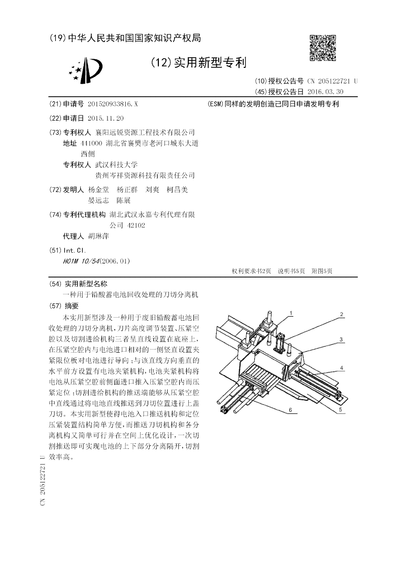 本实用新型涉及一种用于废旧铅酸蓄电池回收处理的刀切分离机,刀片高度调节装置、压紧空腔以及切割进给机构三者呈直线设置在底座上,在压紧空腔内与电池进口相对的一侧竖直设置夹紧限位板对电池进行导向;与该直线方向垂直的水平前方设置有电池夹紧机构,电池夹紧机构将电池从压紧空腔前侧面进口推入压紧空腔内而压紧定位;切割进给机构的推送端能够从压紧空腔中直线通过将电池直线推送到刀切位置进行上盖刀切。本实用新型使得电池入口推送机构和定位压紧装置结构简单方便,而推送刀切机构和各分离机构又简单可行并在空间上优化设计,一次切割推送即可实现电池的上下部分分离隔开,切割效率高。