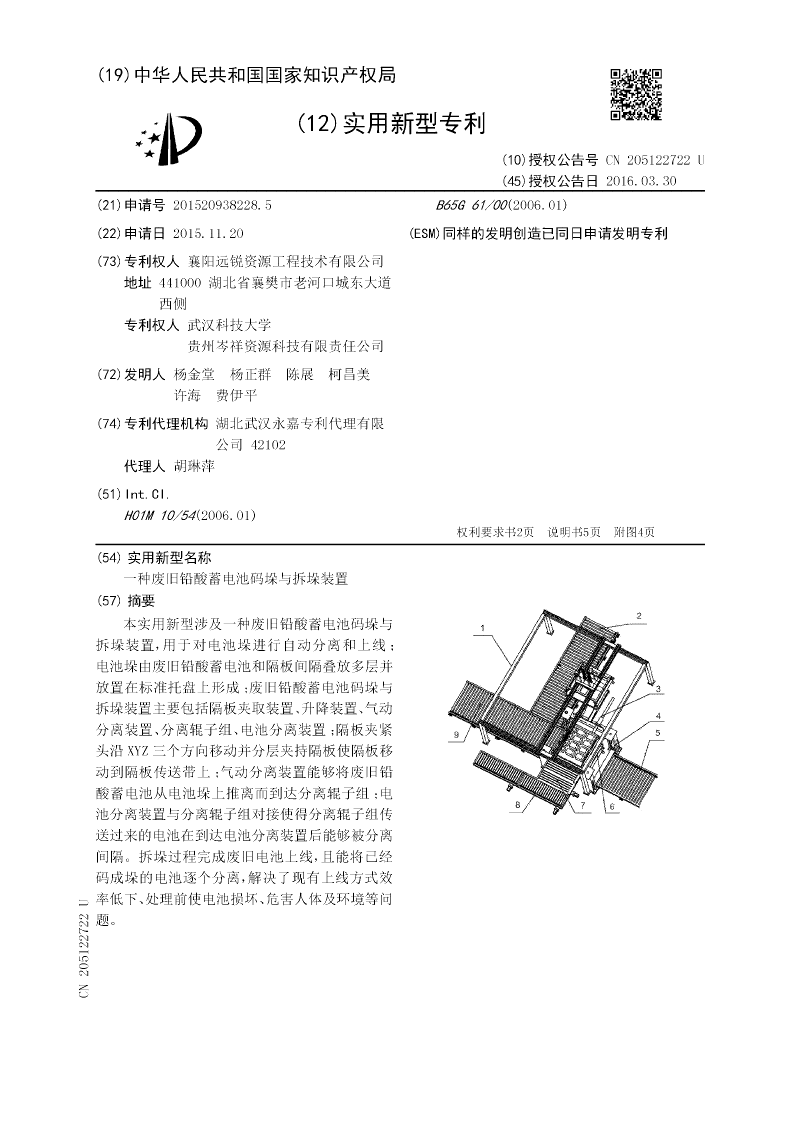 本实用新型涉及一种废旧铅酸蓄电池码垛与拆垛装置,用于对电池垛进行自动分离和上线;电池垛由废旧铅酸蓄电池和隔板间隔叠放多层并放置在标准托盘上形成;废旧铅酸蓄电池码垛与拆垛装置主要包括隔板夹取装置、升降装置、气动分离装置、分离辊子组、电池分离装置;隔板夹紧头沿XYZ三个方向移动并分层夹持隔板使隔板移动到隔板传送带上;气动分离装置能够将废旧铅酸蓄电池从电池垛上推离而到达分离辊子组;电池分离装置与分离辊子组对接使得分离辊子组传送过来的电池在到达电池分离装置后能够被分离间隔。拆垛过程完成废旧电池上线,且能将已经码成垛的电池逐个分离,解决了现有上线方式效率低下、处理前使电池损坏、危害人体及环境等问题。