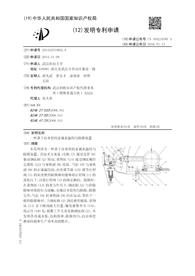 本实用新型涉及一种自动补偿磨损间隙的均匀除膜装置。其方案是:电机(7)通过皮带(6)驱动钢丝刷(2),重物块(13)通过钢丝绳经定滑轮(12)与导轨副(8)连接。气缸(9)与导轨副(8)的右端面铰接,高度调节器(15)调节行程阀(1)的高度使待除膜棒材能够将行程阀(1)的滚轮压下,以便行程阀(1)的阀芯换向。除膜时,在重物块(13)的重力作用下,钢丝刷(2)与待除膜棒材保持恒力接触,实现自补偿均匀除膜。除膜完毕,气缸(9)拉导轨副(8)向右运动,等待下一根待除膜棒材。当钢丝刷(2)到达使用极限,重物块(13)会下降到最大位置,触发报警开关(14),指示灯(18)亮,提醒工作人员更换钢丝刷(2)。本实用新型具有成本低、结构简单、除膜均匀、自动补偿磨损间隙和生产效率高的特点。