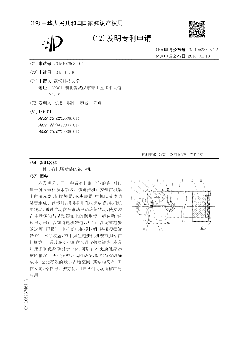 本发明公开了一种带有扭腰功能的跑步机,属于健身器材技术领域。该跑步机由安装在机架上的显示器、扭腰装置、跑步装置、电机以及传动装置组成。跑步时,扭腰盘垂直收起放置,电机通电转动,通过传动皮带带动主动滚轴转动,使安装在主动滚轴与从动滚轴上的跑步带一起转动,通过显示器可以知道电机转速,从而可以调节跑步的速度;扭腰时,电机断电抽掉拉销,将扭腰盘旋转90°水平放置,双手握住跑步机机架双脚站在扭腰盘上,通过转动扭腰盘来进行扭腰锻炼。本发明集多种健身功能于一体,可以在不更换健身器材的情况下进行多种方式的锻炼,既能节省锻炼成本,也能有效的减小占地空间,其结构简单、工作稳定、操作与维护方便,可在各健身场所推广与应用。