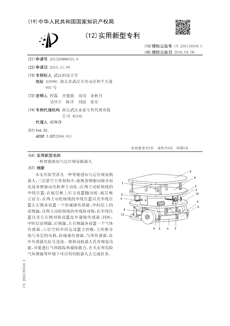 本实用新型涉及一种智能感知与定位嗅觉机器人,三层悬空主体架构中,底板各侧驱动轴分别连接各侧驱动电机和主动轮;在两主动轮轴线的中线位置,在底层板上后方设置随动轮;底层板正前方,在两主动轮轴线的中线位置以及中线位置左右侧各设置一个防碰撞传感器;中间层上的前侧面,以两主动轮轴线的中线轴对称,在中线位置以及左右侧对称设置红外避障传感器;同时,中间层前侧面、后侧面、左右侧面各设置一个气体传感器;上层空间中固定设置主控板,主控板分别与各层的电机、防碰撞传感器、气体传感器、红外传感器电信号连接。使移动机器人具有嗅觉功能,并能进行气体跟踪和避障能力。在火灾和危险气体泄漏等环境下可以利用机器人去完成任务。