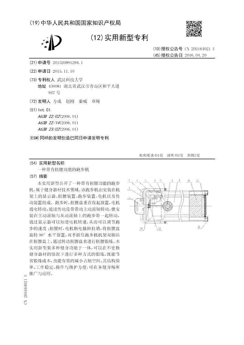 本实用新型公开了一种带有扭腰功能的跑步机,属于健身器材技术领域。该跑步机由安装在机架上的显示器、扭腰装置、跑步装置、电机以及传动装置组成。跑步时,扭腰盘垂直收起放置,电机通电转动,通过传动皮带带动主动滚轴转动,使安装在主动滚轴与从动滚轴上的跑步带一起转动,通过显示器可以知道电机转速,从而可以调节跑步的速度;扭腰时,电机断电抽掉拉销,将扭腰盘旋转90°水平放置,双手握住跑步机机架双脚站在扭腰盘上,通过转动扭腰盘来进行扭腰锻炼。本实用新型集多种健身功能于一体,可以在不更换健身器材的情况下进行多种方式的锻炼,既能节省锻炼成本,也能有效的减小占地空间,其结构简单、工作稳定、操作与维护方便,可在各健身场所推广与应用。