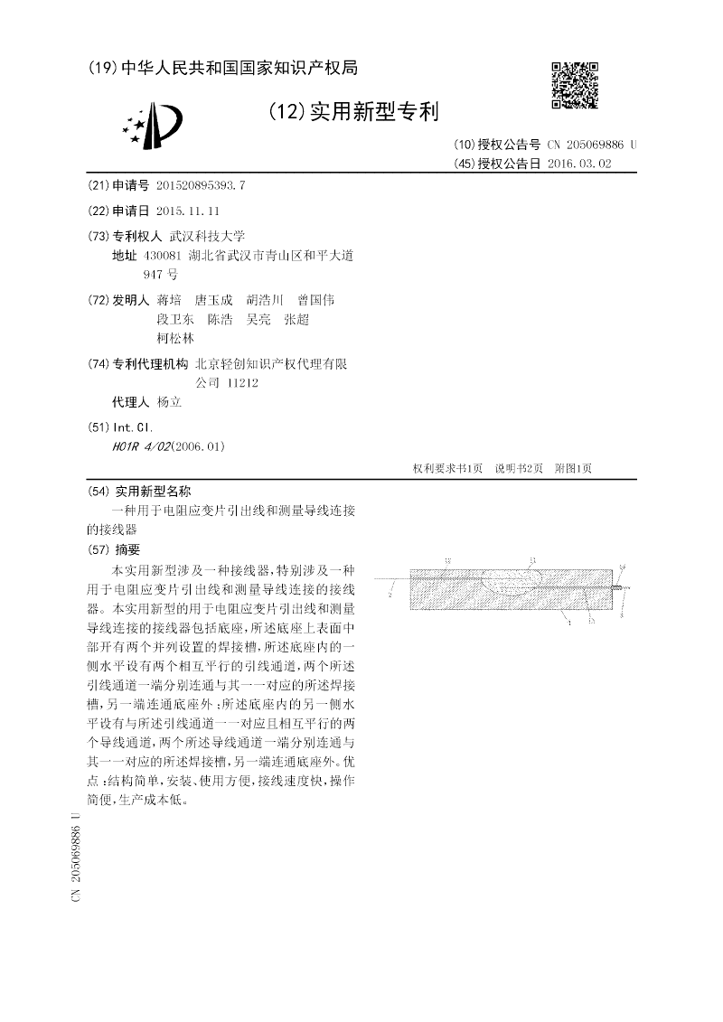 本实用新型涉及一种接线器,特别涉及一种用于电阻应变片引出线和测量导线连接的接线器。本实用新型的用于电阻应变片引出线和测量导线连接的接线器包括底座,所述底座上表面中部开有两个并列设置的焊接槽,所述底座内的一侧水平设有两个相互平行的引线通道,两个所述引线通道一端分别连通与其一一对应的所述焊接槽,另一端连通底座外;所述底座内的另一侧水平设有与所述引线通道一一对应且相互平行的两个导线通道,两个所述导线通道一端分别连通与其一一对应的所述焊接槽,另一端连通底座外。优点:结构简单,安装、使用方便,接线速度快,操作简便,生产成本低。