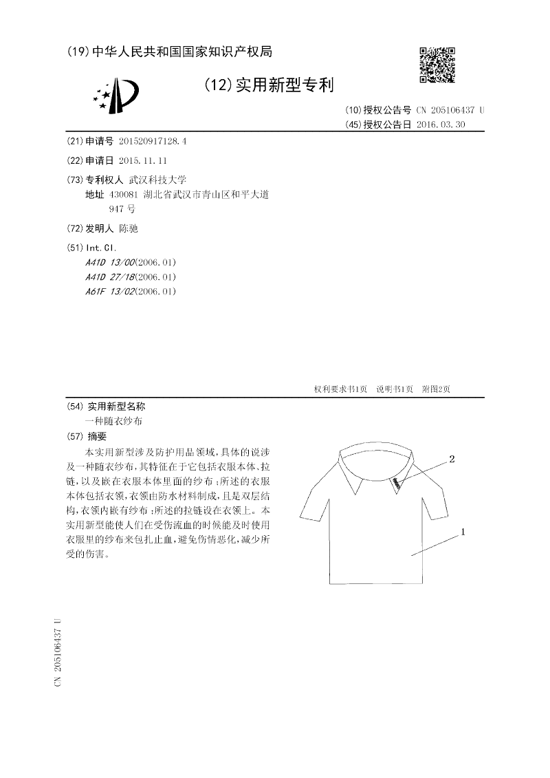本实用新型涉及防护用品领域,具体的说涉及一种随衣纱布,其特征在于它包括衣服本体、拉链,以及嵌在衣服本体里面的纱布;所述的衣服本体包括衣领,衣领由防水材料制成,且是双层结构,衣领内嵌有纱布;所述的拉链设在衣领上。本实用新型能使人们在受伤流血的时候能及时使用衣服里的纱布来包扎止血,避免伤情恶化,减少所受的伤害。