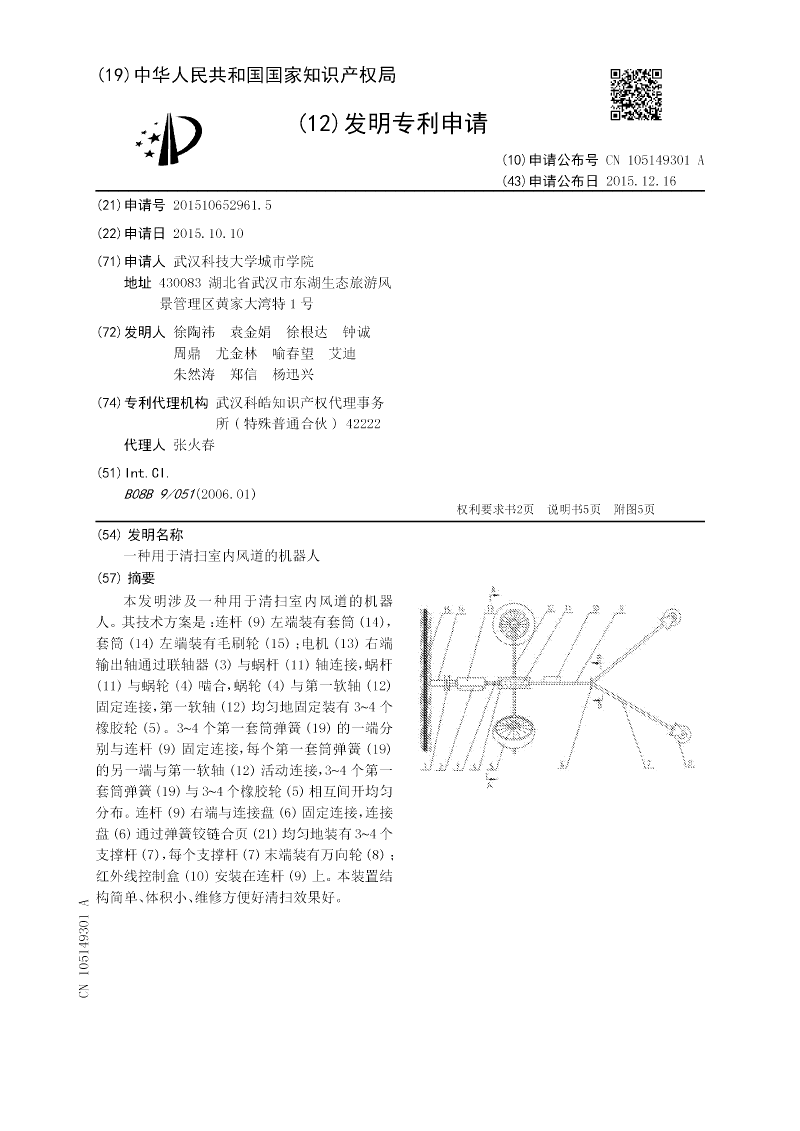 本发明涉及一种用于清扫室内风道的机器人。其技术方案是:连杆(9)左端装有套筒(14),套筒(14)左端装有毛刷轮(15);电机(13)右端输出轴通过联轴器(3)与蜗杆(11)轴连接,蜗杆(11)与蜗轮(4)啮合,蜗轮(4)与第一软轴(12)固定连接,第一软轴(12)均匀地固定装有3~4个橡胶轮(5)。3~4个第一套筒弹簧(19)的一端分别与连杆(9)固定连接,每个第一套筒弹簧(19)的另一端与第一软轴(12)活动连接,3~4个第一套筒弹簧(19)与3~4个橡胶轮(5)相互间开均匀分布。连杆(9)右端与连接盘(6)固定连接,连接盘(6)通过弹簧铰链合页(21)均匀地装有3~4个支撑杆(7),每个支撑杆(7)末端装有万向轮(8);红外线控制盒(10)安装在连杆(9)上。本装置结构简单、体积小、维修方便好清扫效果好。