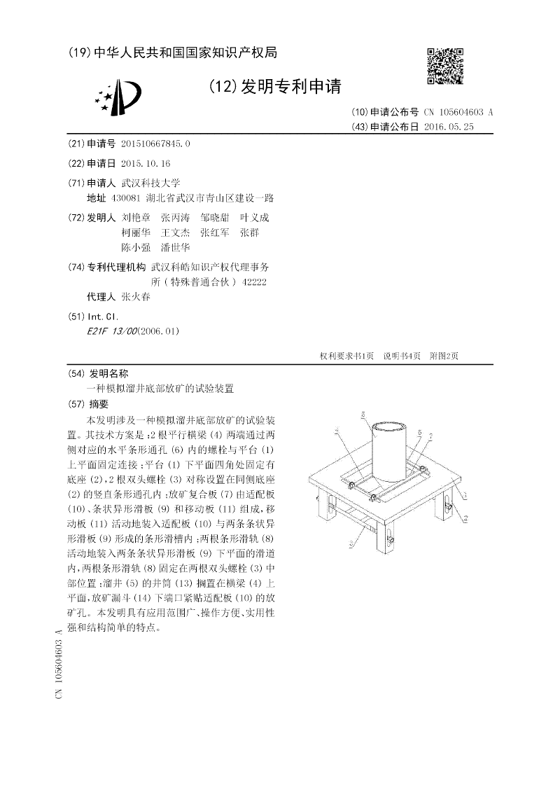 本实用新型涉及一种用于溜井底部放矿的模拟装置。其技术方案是:2根平行横梁(4)两端通过两侧对应的水平条形通孔(6)内的螺栓与平台(1)上平面固定连接;平台(1)下平面四角处固定有底座(2),2根双头螺栓(3)对称设置在同侧底座(2)的竖直条形通孔内;放矿复合板(7)由适配板(10)、条状异形滑板(9)和移动板(11)组成,移动板(11)活动地装入适配板(10)与两条条状异形滑板(9)形成的条形滑槽内;两根条形滑轨(8)活动地装入两条条状异形滑板(9)下平面的滑道内,两根条形滑轨(8)固定在两根双头螺栓(3)中部位置;溜井(5)的井筒(13)搁置在横梁(4)上平面,放矿漏斗(14)下端口紧贴适配板(10)的放矿孔。本实用新型具有应用范围广、操作方便、实用性强和结构简单的特点。