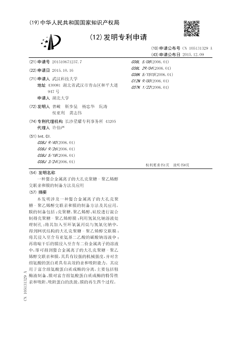 本发明涉及一种螯合金属离子的大孔壳聚糖-聚乙烯醇交联亲和膜的制备方法及其应用。膜的制备包括:壳聚糖、聚乙烯醇、硅胶进行混合制得壳聚糖-聚乙烯醇膜;利用氢氧化钠溶液处理制孔;将其加入至环氧氯丙烷与氢氧化钠中,得到网状结构的大孔壳聚糖-聚乙烯醇交联膜;将其浸入至含有亚氨基二乙酸的碳酸钠溶液中;再将晾干后的膜浸入至含有二价金属离子的溶液中,即可得到螯合金属离子的大孔壳聚糖-聚乙烯醇交联亲和膜,其具有较强的机械强度,并对含组氨酸的蛋白质具有高效的亲和吸附能力。其应用于富含组氨酸蛋白质或酶的分离,主要包括粗酶液制备、膜对富含组氨酸蛋白质或酶的特异性亲和吸附、吸附蛋白的洗脱、膜的再生四个过程。