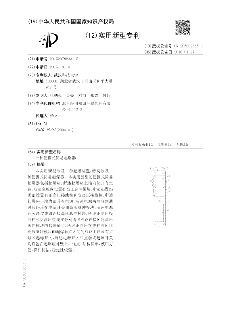 本实用新型涉及一种起爆装置,特别涉及一种便携式简易起爆器。本实用新型的便携式简易起爆器包括起爆座,所述起爆座上端内部开有空腔,所述空腔内设置有高压脉冲模块,所述起爆座顶部设置有正高压接线柱和负高压接线柱,所述起爆座下端内部具有电源,所述电源两端分别通过线路连接电源开关和高压脉冲模块,所述电源开关通过线路连接高压脉冲模块,所述正高压接线柱和负高压接线柱分别通过线路连接所述高压脉冲模块的起爆触点,所述正高压接线柱与所述高压脉冲模块的起爆触点之间的线路上还设有点触式起爆开关,所述电源开关和点触式起爆开关均设置在起爆座外壁上。优点:结构简单,使用方便,操作简洁,稳定性较强。
