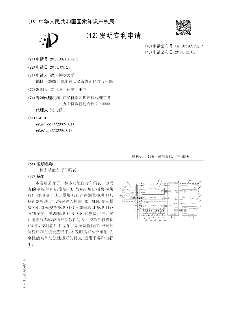 本发明公开了一种多功能自行车码表。该码表的主控单片机模块(3)与GSM短信报警模块(1)、RFID身份认证模块(2)、速度测量模块(4)、扬声器模块(7)、按键输入模块(8)、OLED显示模块(9)、灯光安全模块(16)和加速度计模块(17)分别连接。电源模块(20)为所有模块供电。多功能自行车码表的控制软件写入主控单片机模块(3)中,控制软件中包含了系统防盗程序、声光控制程序和系统设置程序。本发明具有易于操作、安全性能高和防盗性能好的特点,适用于各种自行车。