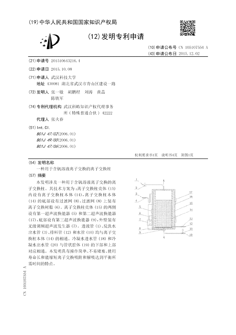 本实用新型涉及一种富集含钒溶液中钒的离子交换柱。其技术方案为:离子交换柱壳体(15)内设有离子交换柱本体(14),离子交换柱本体(14)的底部设有过滤网(8),过滤网(8)上装有离子交换树脂(6)。离子交换柱壳体(15)的两侧设有第一超声波换能器(5)和第二超声波换能器(17),底部设有第三超声波换能器(9),外壁装有无级调频超声波发生器(7)。进液管(1)、反洗水出水管(3)、排料管(12)和水管(10)均与离子交换柱本体(14)的相通。冷凝水进水管(18)和冷凝水出水管(20)与管状腔体(19)的下部和上部对应相通。本实用新型具有操作简单、不易堵塞、使用寿命长和能缩短离子交换吸附和解吸达到平衡所需时间的特点。