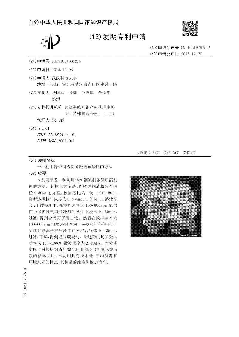 本发明涉及一种利用转炉钢渣制备轻质碳酸钙的方法。其技术方案是:将转炉钢渣粉碎至粒径< 150μm的颗粒,按固液比为1Kg︰(10~50)L将所述颗粒与浓度为0.5~4mol/L的NH4Cl溶液混合;于微波场中,在搅拌速率为100~600rpm、氮气作为保护性气氛和冷凝的条件下浸出10~60min,过滤,得到含钙离子浸出液。然后在搅拌速率为100~600rpm和水浴温度为15~90℃的条件下,向所述含钙离子浸出液中通入混合气体10~30min,过滤,干燥,得到轻质碳酸钙。所述微波场的微波功率为100~1000W,微波频率为2.45GHz。本发明实现了对转炉钢渣的综合利用和浸出剂氯化铵溶液的循环利用;本发明具有成本低、节约资源和环境友好的特点,其制品的纯度和附加值高。