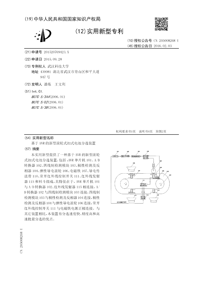 本实用新型提供了一种基于AVR的新型滚轮式扣式电池分选装置,包括:AVR单片机101、A/D转换器102、四线制检测模块103、极性检测及反相器104、弹性导电滚轮106、电磁铁107、导电传送带110、常开红外线控制开关111、红外线发射器115和料斗组成,其特征在于,AVR单片机101与A/D转换器102、红外线发射器115相连接,A/D转换器102与四线制检测模块103连接,四线制检测模块103与极性检测及反相器104连接,极性检测及反相器104与弹性导电滚轮106连接,常开红外线控制开关111与电磁铁电源正极连接。与其它装置相比,本装置有分选速度快、精度高和高速批量分选的优点。