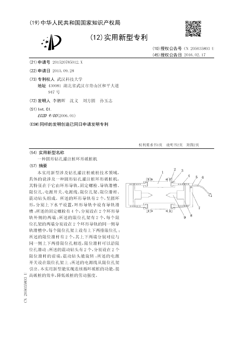 本实用新型涉及钻孔灌注桩破桩技术领域,具体的说涉及一种圆形钻孔灌注桩环形破桩机,其特征在于它由环形导轨、固定螺栓、导轨滑槽、限位孔、电源开关、电源线、限位孔架、限位滑杆、震动钻头组成。所述的环形导轨有2个,呈圆环形,分别上下水平设置,环形导轨中设有导轨滑槽;所述的固定螺栓有4个,分别设在2个环形导轨外侧的两端;所述的限位孔架有2个,每个限位孔架的两端分别设在2个环形导轨的同一侧导轨滑槽中,每个限位孔架上设有上下两排限位孔;所述的限位滑杆有2个,其上下两端分别对应与同一侧上下两排限位孔相连,限位滑杆可以沿限位孔滑动;所述的震动钻头有2个,分别设在2个限位滑杆的前端,震动钻头能旋转;所述的电源开关设在限位孔架上;所述的电源线从限位孔架引出。本实用新型能实现连续循环破桩的功能,提高破桩的效率,降低破桩的劳动强度。