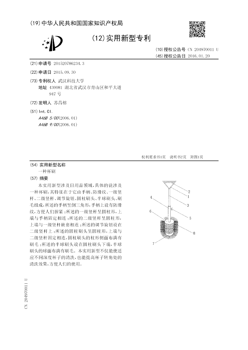 本实用新型涉及日用品领域,具体的说涉及一种杯刷,其特征在于它由手柄、防滑纹、一级竖杆、二级竖杆、调节旋钮、圆柱刷头、半球刷头、刷毛组成,所述的手柄呈倒三角形,手柄上设有防滑纹,方便人们握紧;所述的一级竖杆呈圆柱形,上端与手柄固定相连;所述的二级竖杆呈圆柱形,上端与一级竖杆嵌套相连;所述的调节旋钮设在二级竖杆上;所述的圆柱刷头呈圆柱形,上端与二级竖杆固定相连,圆柱刷头的柱形侧面布满有刷毛;所述的半球刷头设在圆柱刷头下端,半球刷头的球面布满有刷毛。本实用新型不仅能使适应不同深度杯子的清洗,也能提高杯子转角处的清洗效果,方便人们的使用。