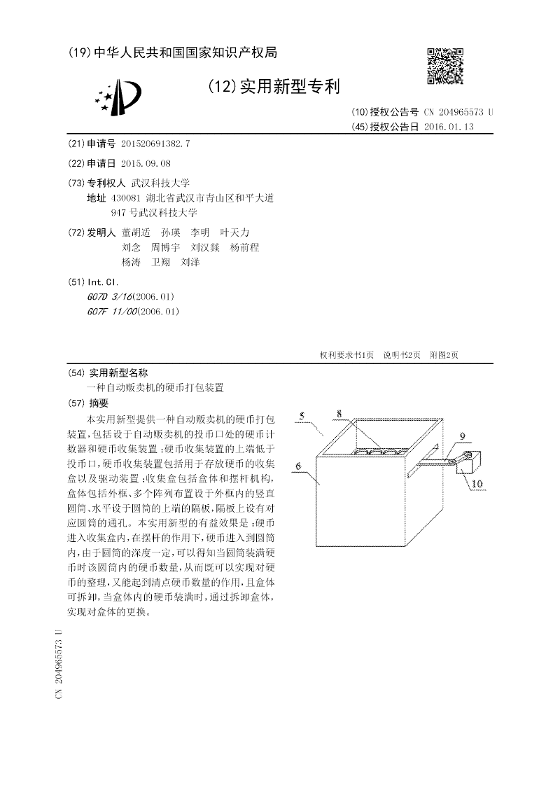 本实用新型提供一种自动贩卖机的硬币打包装置,包括设于自动贩卖机的投币口处的硬币计数器和硬币收集装置;硬币收集装置的上端低于投币口,硬币收集装置包括用于存放硬币的收集盒以及驱动装置;收集盒包括盒体和摆杆机构,盒体包括外框、多个阵列布置设于外框内的竖直圆筒、水平设于圆筒的上端的隔板,隔板上设有对应圆筒的通孔。本实用新型的有益效果是:硬币进入收集盒内,在摆杆的作用下,硬币进入到圆筒内,由于圆筒的深度一定,可以得知当圆筒装满硬币时该圆筒内的硬币数量,从而既可以实现对硬币的整理,又能起到清点硬币数量的作用,且盒体可拆卸,当盒体内的硬币装满时,通过拆卸盒体,实现对盒体的更换。