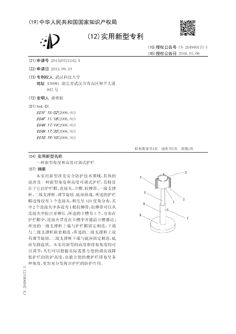 本实用新型涉及安全防护技术领域,具体的说涉及一种新型角度和高度可调式护栏,其特征在于它由护栏帽、连接夹、卡槽、拉伸带、一级支撑杆、二级支撑杆、调节旋钮、底座组成。所述的护栏帽边缘设有3个连接夹,相互呈120度角分布,其中2个连接夹中各设有1根拉伸带,拉伸带可以从连接夹中拉出并伸长;所述的卡槽有3个,分布在护栏帽中,连接夹贯连在卡槽中并能沿卡槽滑动;所述的一级支撑杆上端与护栏帽固定相连,下端与二级支撑杆嵌套相连;所述的二级支撑杆上设有调节旋钮,二级支撑杆下端与底座固定相连,底座呈圆盘状。本实用新型的高度和排布角度均可以调节,人们可以根据实际需要方便的调高或降低护栏的防护高度,也能方便的使护栏排布呈各种角度,更加充分发挥出护栏的防护作用。