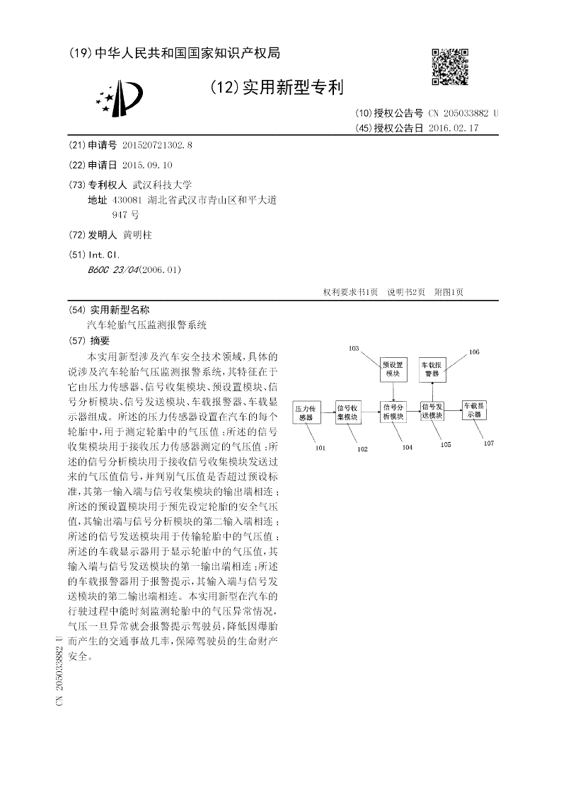 本实用新型涉及汽车安全技术领域,具体的说涉及汽车轮胎气压监测报警系统,其特征在于它由压力传感器、信号收集模块、预设置模块、信号分析模块、信号发送模块、车载报警器、车载显示器组成。所述的压力传感器设置在汽车的每个轮胎中,用于测定轮胎中的气压值;所述的信号收集模块用于接收压力传感器测定的气压值;所述的信号分析模块用于接收信号收集模块发送过来的气压值信号,并判别气压值是否超过预设标准,其第一输入端与信号收集模块的输出端相连;所述的预设置模块用于预先设定轮胎的安全气压值,其输出端与信号分析模块的第二输入端相连;所述的信号发送模块用于传输轮胎中的气压值;所述的车载显示器用于显示轮胎中的气压值,其输入端与信号发送模块的第一输出端相连;所述的车载报警器用于报警提示,其输入端与信号发送模块的第二输出端相连。本实用新型在汽车的行驶过程中能时刻监测轮胎中的气压异常情况,气压一旦异常就会报警提示驾驶员,降低因爆胎而产生的交通事故几率,保障驾驶员的生命财产安全。