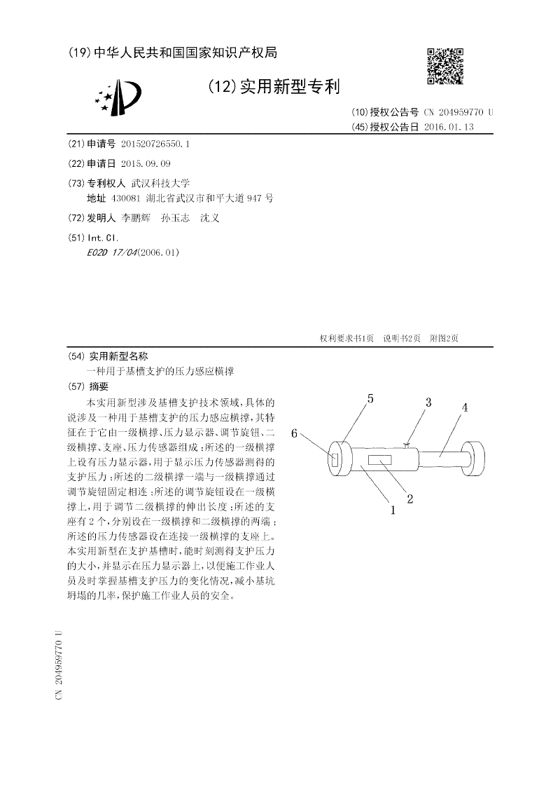 本实用新型涉及基槽支护技术领域,具体的说涉及一种用于基槽支护的压力感应横撑,其特征在于它由一级横撑、压力显示器、调节旋钮、二级横撑、支座、压力传感器组成;所述的一级横撑上设有压力显示器,用于显示压力传感器测得的支护压力;所述的二级横撑一端与一级横撑通过调节旋钮固定相连;所述的调节旋钮设在一级横撑上,用于调节二级横撑的伸出长度;所述的支座有2个,分别设在一级横撑和二级横撑的两端;所述的压力传感器设在连接一级横撑的支座上。本实用新型在支护基槽时,能时刻测得支护压力的大小,并显示在压力显示器上,以便施工作业人员及时掌握基槽支护压力的变化情况,减小基坑坍塌的几率,保护施工作业人员的安全。