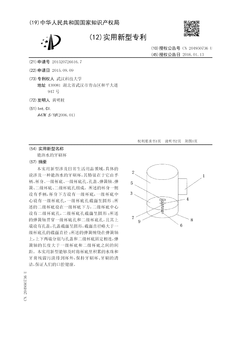 本实用新型涉及日常生活用品领域,具体的说涉及一种能沥水的牙刷杯,其特征在于它由手柄、杯身、一级杯底、一级杯底孔、孔盖、弹簧轴、弹簧、二级杯底、二级杯底孔组成。所述的杯身一侧设有手柄,杯身下方设有一级杯底,一级杯底中心设有一级杯底孔,一级杯底孔截面呈圆形;所述的二级杯底设在一级杯底下方,二级杯底中心设有二级杯底孔,二级杯底孔截面呈圆形;所述的弹簧轴贯穿一级杯底孔和二级杯底孔,且其上端设有孔盖,孔盖截面呈圆形,截面直径略大于一级杯底孔的截面直径;所述的弹簧缠绕在弹簧轴上,上下两端分别与孔盖和二级杯底固定相连,弹簧轴的长度大于一级杯底和二级杯底之间的间距。本实用新型能够及时将杯底里积累的水珠和牙膏残留污渍排到杯外,保持牙刷杯、牙刷的清洁,保证人们的口腔健康。