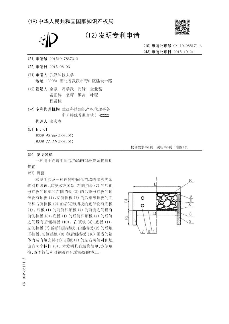 连铸中间包用双挡墙结构夹杂物捕捉装置