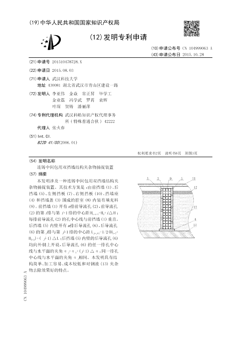 本发明涉及一种连铸中间包用双挡墙结构夹杂物捕捉装置。其技术方案是:由前挡墙(1)、后挡墙(5)、左侧挡板(7)、右侧挡板(10)、挡墙座(4)和挡墙盖(3)围成的腔室(8)内装有填充料(9)。前挡墙(1)开有n排前导流孔(2),前导流孔(2)的第i排与第i+1排的中心距Hi~i+1=H0+i△H;每排前导流孔(2)的孔中心线与前挡墙(1)垂直。后挡墙(5)内壁开有m排后导流孔(6),后导流孔(6)的第j排与第j+1排的中心距Lj~j+1=1/2(H1~2+?H2~3)+(?j-1)△L;后挡墙(5)内壁的后导流孔(6)均向外朝上开设,后导流孔(6)的任一排孔中心线与水平面的夹角αj=α1+(j-1)△α,同一排孔中心线与水平面的夹角αj相同。本发明具有结构简单、加工容易、成本较低和对钢液(13)夹杂物去除效果好的特点。