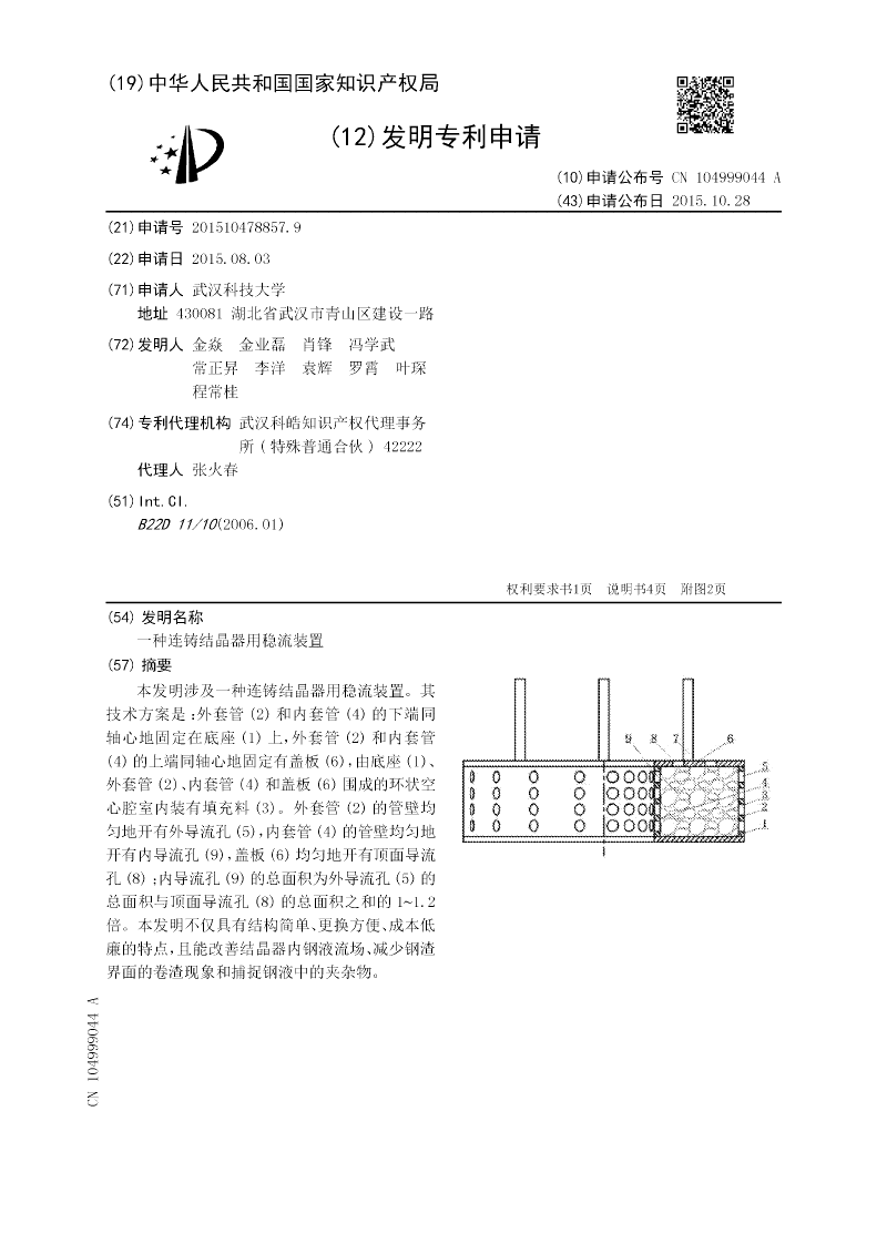 本发明涉及一种连铸结晶器用稳流装置。其技术方案是:外套管(2)和内套管(4)的下端同轴心地固定在底座(1)上,外套管(2)和内套管(4)的上端同轴心地固定有盖板(6),由底座(1)、外套管(2)、内套管(4)和盖板(6)围成的环状空心腔室内装有填充料(3)。外套管(2)的管壁均匀地开有外导流孔(5),内套管(4)的管壁均匀地开有内导流孔(9),盖板(6)均匀地开有顶面导流孔(8);内导流孔(9)的总面积为外导流孔(5)的总面积与顶面导流孔(8)的总面积之和的1~1.2倍。本发明不仅具有结构简单、更换方便、成本低廉的特点,且能改善结晶器内钢液流场、减少钢渣界面的卷渣现象和捕捉钢液中的夹杂物。