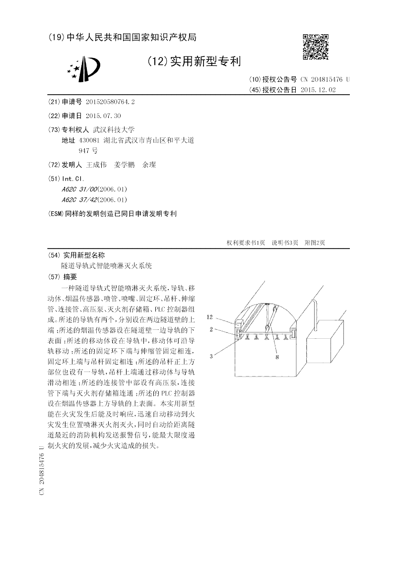 本发明涉及隧道灭火技术领域,具体的说是一种隧道导轨式智能喷淋灭火系统,其特征在于它由导轨、移动体、烟温传感器、喷管、喷嘴、固定环、吊杆、伸缩管、连接管、高压泵、灭火剂存储箱、PLC控制器组成;所述的导轨有两个;所述的烟温传感器设在隧道壁一边导轨的下表面;所述的移动体设在导轨中;所述的喷管两端均与移动体固定相连;所述的喷嘴设在喷管下表面;所述的伸缩管一端与喷管连通;所述的固定环下端与伸缩管固定相连;所述的吊杆正上方部位也设有一导轨;所述的连接管中部设有高压泵;所述的PLC控制器设在烟温传感器上方导轨的上表面。?本发明能最大限度遏制火灾的发展,减少火灾造成的损失。