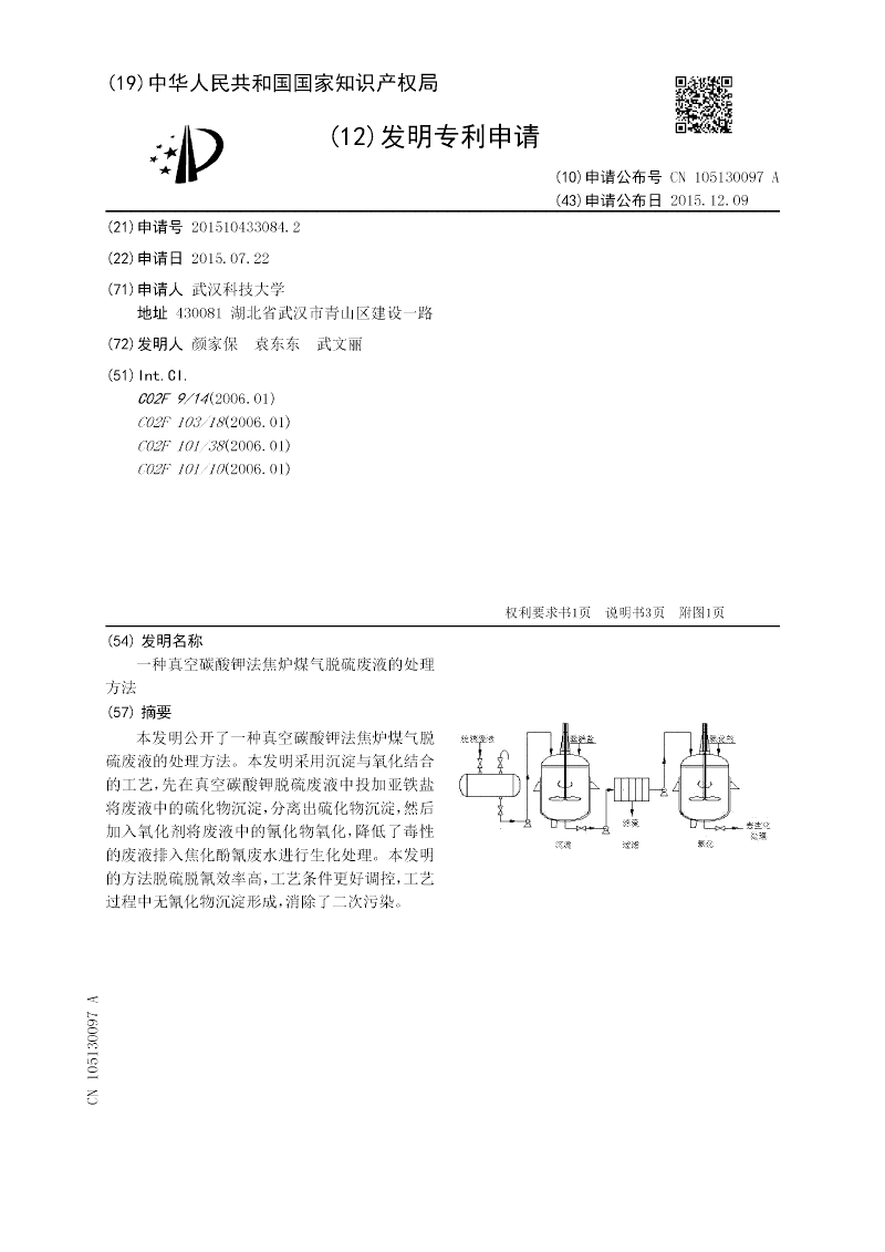 本发明公开了一种真空碳酸钾法焦炉煤气脱硫废液的处理方法。本发明采用沉淀与氧化结合的工艺,先在真空碳酸钾脱硫废液中投加亚铁盐将废液中的硫化物沉淀,分离出硫化物沉淀,然后加入氧化剂将废液中的氰化物氧化,降低了毒性的废液排入焦化酚氰废水进行生化处理。本发明的方法脱硫脱氰效率高,工艺条件更好调控,工艺过程中无氰化物沉淀形成,消除了二次污染。