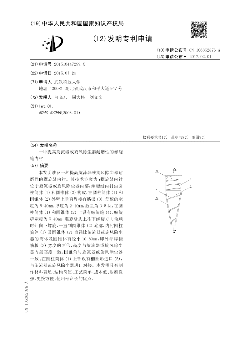 本实用新型涉及一种提高旋流器或旋风除尘器耐磨性的螺旋缝内衬。其技术方案为:螺旋缝内衬位于旋流器或旋风除尘器内部,螺旋缝内衬由圆柱筒体体(1)和圆锥体(2)构成,在圆柱筒体(1)和圆锥体(2)外壁上垂直焊接有筋板(3),筋板的宽度为5-40mm,厚度为2-10mm,数量为3-5块,在圆柱筒体体(1)和圆锥体(2)上设有螺旋缝(4),螺旋缝宽度为5-40mm,螺旋缝从上往下螺旋方向为顺时针向下螺旋,一直到圆锥体(2)底部,内衬圆柱筒体(1)及圆锥体(2)直径比旋流器或旋风除尘器的筒体及圆锥体直径小10-80mm,即外壁焊接筋板(3)宽度的两倍,高度与旋流器或旋风除尘器内部高度一致,圆锥角与旋流器或旋风除尘器一致;在圆柱筒体(1)上部设有椭圆形进口(5),与旋流器或旋风除尘器进口对接。本实用新型具有制作材料普通、结构简便、工艺简单、成本低、耐磨性强、更换方便、使用寿命长的优点。