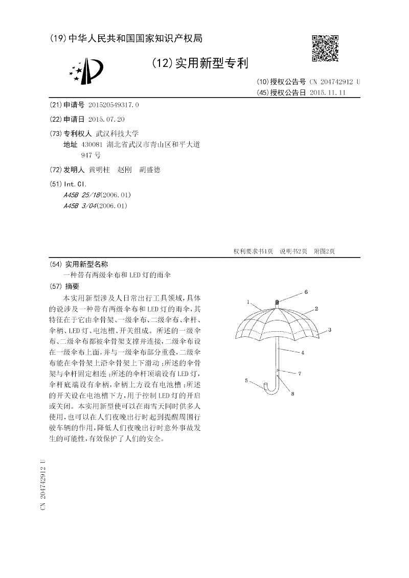 本实用新型涉及人日常出行工具领域,具体的说涉及一种带有两级伞布和LED灯的雨伞,其特征在于它由伞骨架、一级伞布、二级伞布、伞杆、伞柄、LED灯、电池槽、开关组成。所述的一级伞布、二级伞布都被伞骨架支撑并连接,二级伞布设在一级伞布上面,并与一级伞布部分重叠,二级伞布能在伞骨架上沿伞骨架上下滑动;所述的伞骨架与伞杆固定相连;所述的伞杆顶端设有LED灯,伞杆底端设有伞柄,伞柄上方设有电池槽;所述的开关设在电池槽下方,用于控制LED灯的开启或关闭。本实用新型使可以在雨雪天同时供多人使用,也可以在人们夜晚出行时起到提醒周围行驶车辆的作用,降低人们夜晚出行时意外事故发生的可能性,有效保护了人们的安全。