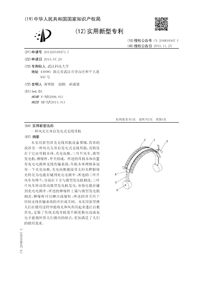 本实用新型涉及无线耳机设备领域,具体的说涉及一种风光互补自发电式无线耳机,其特征在于它由耳机本体、光电池板、三叶片风车、微型发电机、伸缩杆、开关组成。所述的耳机本体内置有充电电源和无线传输系统,耳机本体两侧各设有一个光电池板,光电池板能接受太阳光照射将光转化为电能存储到充电电源中;所述的三叶片风车有两个,分别在下方与微型发电机相连,三叶片风车转动带动微型发电机发电,并将电能存储到充电电源中;所述的伸缩杆上端与微型发电机相连,伸缩杆可以伸出或缩短;所述的开关用于控制无线传输系统的开启或关闭。本实用新型使人们在使用过程中能将光和风利用起来进行自我供电,克服了传统无线耳机需不断更换电池或充电才能循环供人们使用的缺点,更加满足了人们的使用需求。