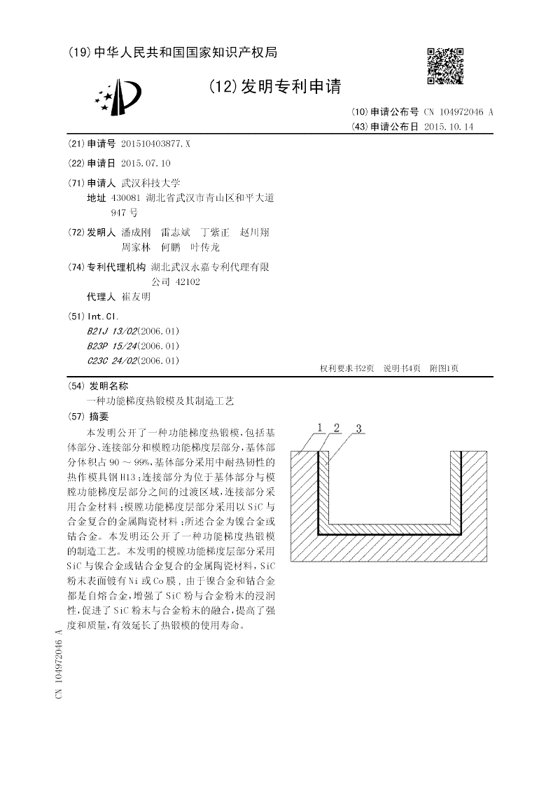 本发明公开了一种功能梯度热锻模,包括基体部分、连接部分和模膛功能梯度层部分,基体部分体积占90~99%,基体部分采用中耐热韧性的热作模具钢H13;连接部分为位于基体部分与模膛功能梯度层部分之间的过渡区域,连接部分采用合金材料;模膛功能梯度层部分采用以SiC与合金复合的金属陶瓷材料;所述合金为镍合金或钴合金。本发明还公开了一种功能梯度热锻模的制造工艺。本发明的模膛功能梯度层部分采用SiC与镍合金或钴合金复合的金属陶瓷材料,SiC粉末表面镀有Ni或Co膜,由于镍合金和钴合金都是自熔合金,增强了SiC粉与合金粉末的浸润性,促进了SiC粉末与合金粉末的融合,提高了强度和质量,有效延长了热锻模的使用寿命。