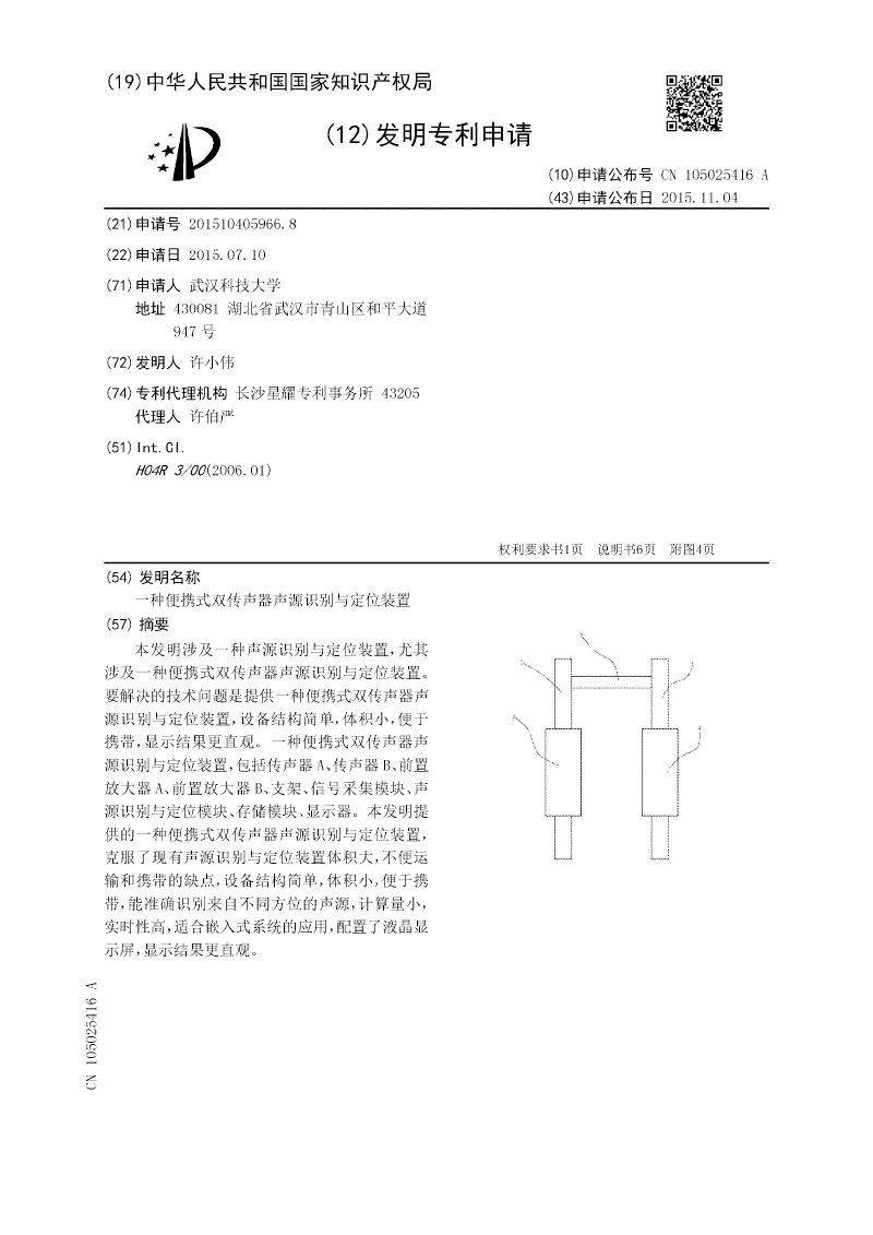 本实用新型涉及一种声源识别与定位装置,尤其涉及一种便携式双传声器声源识别与定位装置。要解决的技术问题是提供一种便携式双传声器声源识别与定位装置,设备结构简单,体积小,便于携带,显示结果更直观。一种便携式双传声器声源识别与定位装置,包括传声器A、传声器B、前置放大器A、前置放大器B、支架、信号采集模块、声源识别与定位模块、存储模块、显示器。本实用新型提供的一种便携式双传声器声源识别与定位装置,克服了现有声源识别与定位装置体积大,不便运输和携带的缺点,设备结构简单,体积小,便于携带,能准确识别来自不同方位的声源,计算量小,实时性高,适合嵌入式系统的应用,配置了液晶显示屏,显示结果更直观。