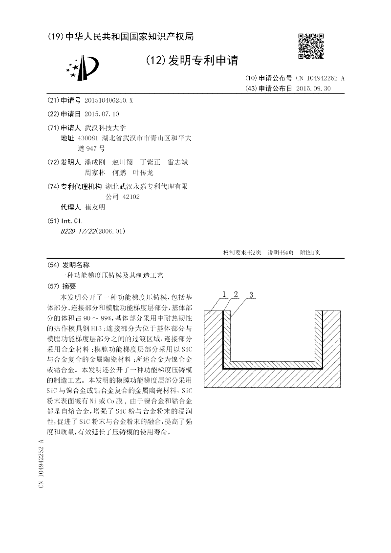 本发明公开了一种功能梯度压铸模,包括基体部分、连接部分和模膛功能梯度层部分,基体部分的体积占90~99%,基体部分采用中耐热韧性的热作模具钢H13;连接部分为位于基体部分与模膛功能梯度层部分之间的过渡区域,连接部分采用合金材料;模膛功能梯度层部分采用以SiC与合金复合的金属陶瓷材料;所述合金为镍合金或钴合金。本发明还公开了一种功能梯度压铸模的制造工艺。本发明的模膛功能梯度层部分采用SiC与镍合金或钴合金复合的金属陶瓷材料,SiC粉末表面镀有Ni或Co膜,由于镍合金和钴合金都是自熔合金,增强了SiC粉与合金粉末的浸润性,促进了SiC粉末与合金粉末的融合,提高了强度和质量,有效延长了压铸模的使用寿命。