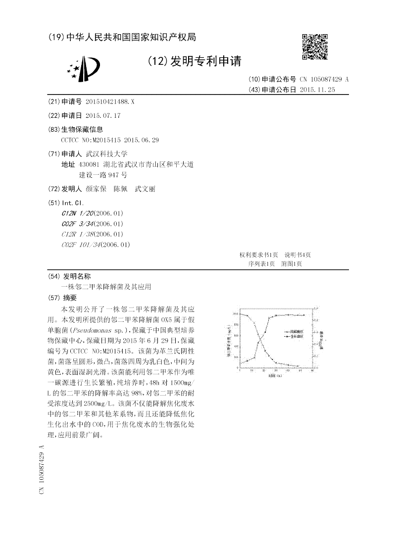 本发明公开了一株邻二甲苯降解菌及其应用。本发明所提供的邻二甲苯降解菌OX5属于假单胞菌(Pseudomonas?sp.),保藏于中国典型培养物保藏中心,保藏日期为2015年6月29日,保藏编号为CCTCC?NO : M2015415。该菌为革兰氏阴性菌,菌落呈圆形,微凸,菌落四周为乳白色,中间为黄色,表面湿润光滑。该菌能利用邻二甲苯作为唯一碳源进行生长繁殖,纯培养时,48h对1500mg/L的邻二甲苯的降解率高达98%,对邻二甲苯的耐受浓度达到2500mg/L。该菌不仅能降解焦化废水中的邻二甲苯和其他苯系物,而且还能降低焦化生化出水中的COD,用于焦化废水的生物强化处理,应用前景广阔。