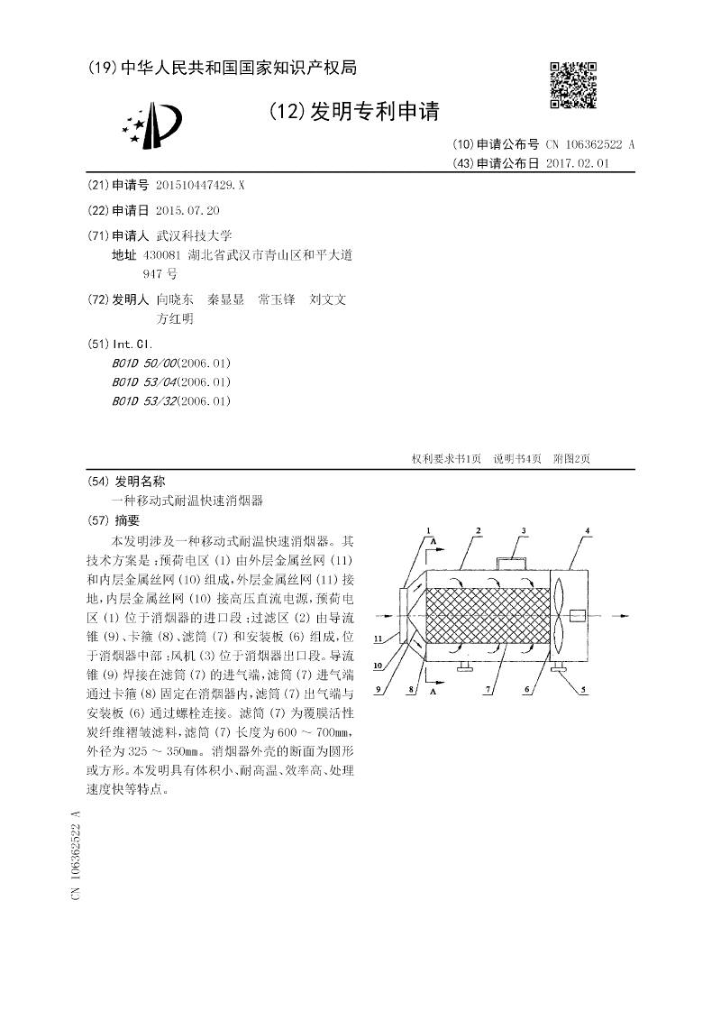 本发明涉及一种移动式耐温快速消烟器。其技术方案是:预荷电区(1)由外层金属丝网(11)和内层金属丝网(10)组成,外层金属丝网(11)接地,内层金属丝网(10)接高压直流电源,预荷电区(1)位于消烟器的进口段;过滤区(2)由导流锥(9)、卡箍(8)、滤筒(7)和安装板(6)组成,位于消烟器中部;风机(3)位于消烟器出口段。导流锥(9)焊接在滤筒(7)的进气端,滤筒(7)进气端通过卡箍(8)固定在消烟器内,滤筒(7)出气端与安装板(6)通过螺栓连接。滤筒(7)为覆膜活性炭纤维褶皱滤料,滤筒(7)长度为600~700mm,外径为325~350mm。消烟器外壳的断面为圆形或方形。本发明具有体积小、耐高温、效率高、处理速度快等特点。