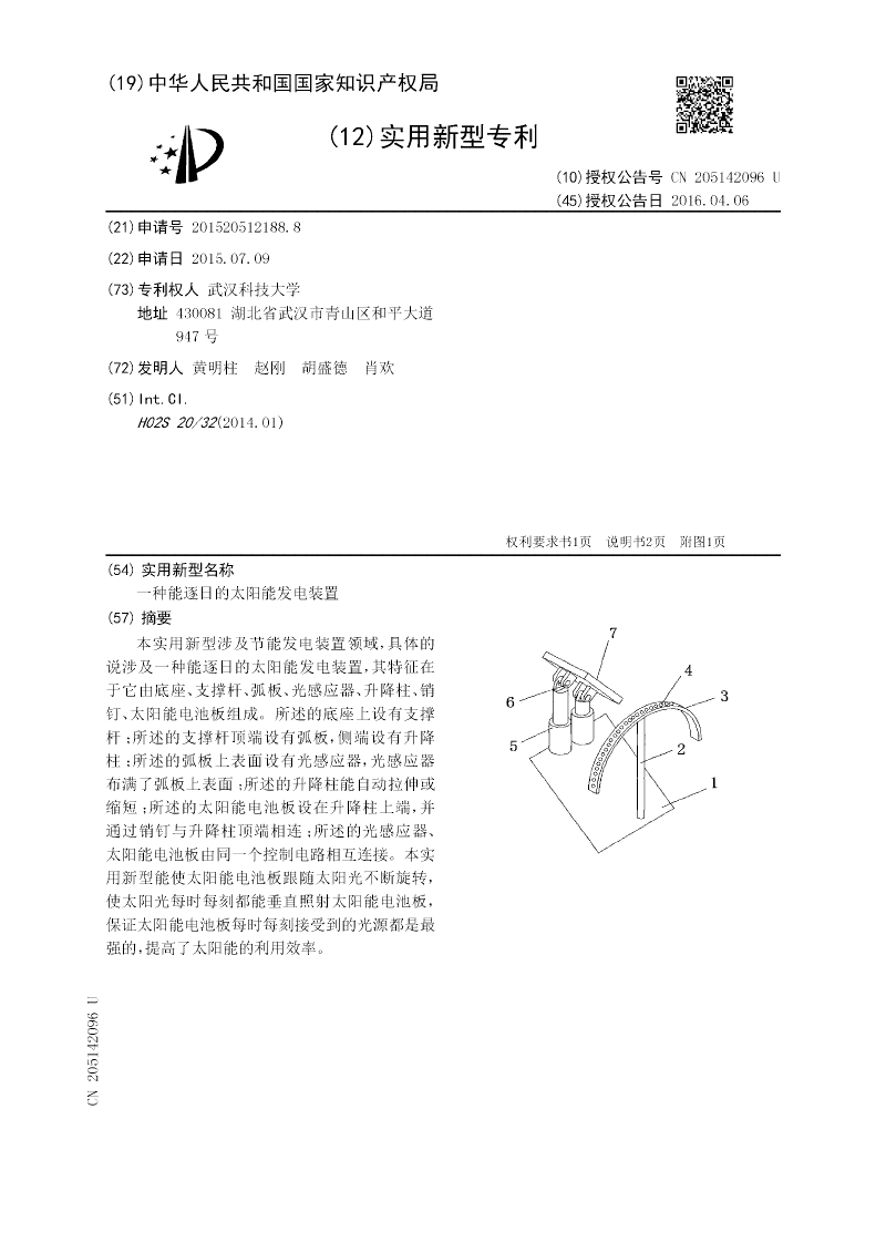 本实用新型涉及节能发电装置领域,具体的说涉及一种能逐日的太阳能发电装置,其特征在于它由底座、支撑杆、弧板、光感应器、升降柱、销钉、太阳能电池板组成。所述的底座上设有支撑杆;所述的支撑杆顶端设有弧板,侧端设有升降柱;所述的弧板上表面设有光感应器,光感应器布满了弧板上表面;所述的升降柱能自动拉伸或缩短;所述的太阳能电池板设在升降柱上端,并通过销钉与升降柱顶端相连;所述的光感应器、太阳能电池板由同一个控制电路相互连接。本实用新型能使太阳能电池板跟随太阳光不断旋转,使太阳光每时每刻都能垂直照射太阳能电池板,保证太阳能电池板每时每刻接受到的光源都是最强的,提高了太阳能的利用效率。