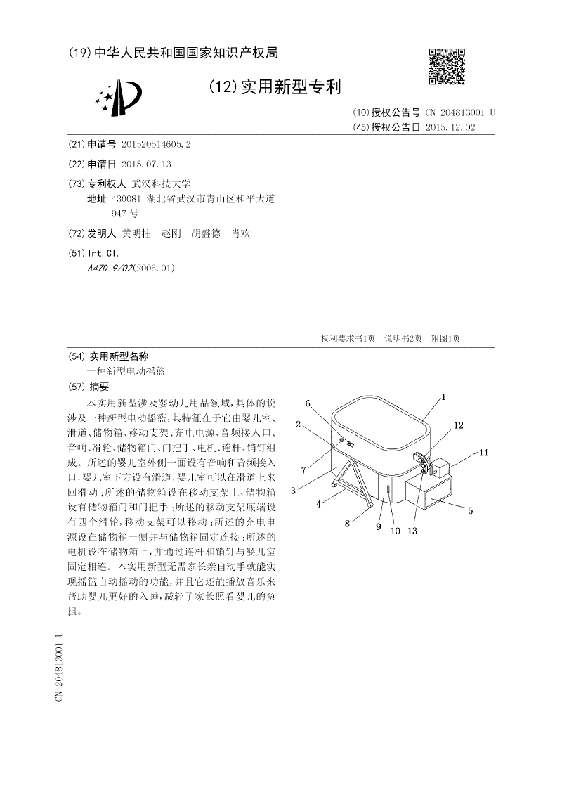 本实用新型涉及婴幼儿用品领域,具体的说涉及一种新型电动摇篮,其特征在于它由婴儿室、滑道、储物箱、移动支架、充电电源、音频接入口、音响、滑轮、储物箱门、门把手、电机、连杆、销钉组成。所述的婴儿室外侧一面设有音响和音频接入口,婴儿室下方设有滑道,婴儿室可以在滑道上来回滑动;所述的储物箱设在移动支架上,储物箱设有储物箱门和门把手;所述的移动支架底端设有四个滑轮,移动支架可以移动;所述的充电电源设在储物箱一侧并与储物箱固定连接;所述的电机设在储物箱上,并通过连杆和销钉与婴儿室固定相连。本实用新型无需家长亲自动手就能实现摇篮自动摇动的功能,并且它还能播放音乐来帮助婴儿更好的入睡,减轻了家长照看婴儿的负担。