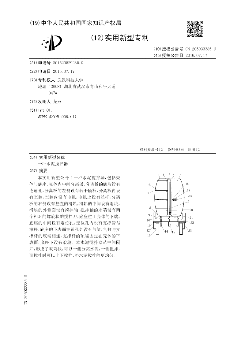 本实用新型公开了一种水泥搅拌器,包括壳体与底座,壳体内中间分离板,分离板的底端设有连通孔,分离板的左侧设有若干隔板,分离板内设有空腔,空腔内设有电机,电机上设有丝杆,分离板的右侧设有竖直的滑轨,滑轨的中间设有滑块,滑块的外侧面设有搅拌轴,搅拌轴的末端设有两个相对的螺旋状的搅拌刀,底座位于壳体的下端,底座的中间设有定位孔,定位孔内设有支撑管与撑杆,底座的下表面在通孔处设有气缸,气缸与支撑杆的底端相连,支撑杆的顶端固定在壳体的下表面,底座下设有滚轮。本水泥搅拌器从中间隔开,形成了双筒状,可以一侧分离水泥,一侧搅拌,而搅拌时可以上下搅拌,将水泥搅拌的更均匀。