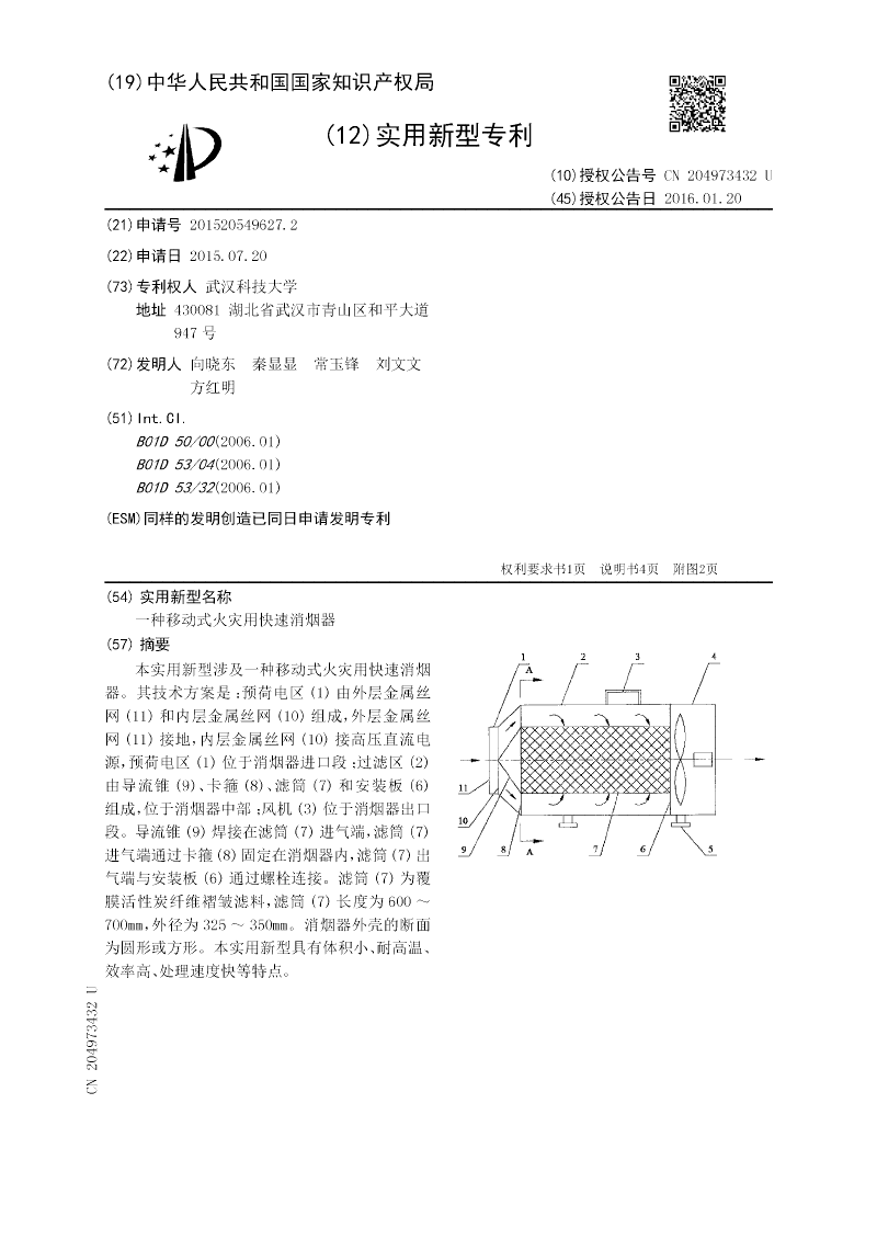 本实用新型涉及一种移动式火灾用快速消烟器。其技术方案是:预荷电区(1)由外层金属丝网(11)和内层金属丝网(10)组成,外层金属丝网(11)接地,内层金属丝网(10)接高压直流电源,预荷电区(1)位于消烟器进口段;过滤区(2)由导流锥(9)、卡箍(8)、滤筒(7)和安装板(6)组成,位于消烟器中部;风机(3)位于消烟器出口段。导流锥(9)焊接在滤筒(7)进气端,滤筒(7)进气端通过卡箍(8)固定在消烟器内,滤筒(7)出气端与安装板(6)通过螺栓连接。滤筒(7)为覆膜活性炭纤维褶皱滤料,滤筒(7)长度为600~700mm,外径为325~350mm。消烟器外壳的断面为圆形或方形。本实用新型具有体积小、耐高温、效率高、处理速度快等特点。