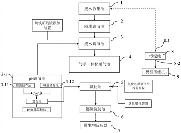 本实用新型提供气浮膜生物反应器含砷废水处理装置,包括废水收集池、隔油调节池、废水调节池、气浮一体化曝气池、氧化池、絮凝沉淀池、膜生物反应器、污泥池;废水调节池外设置有工业副产品硫铁矿残渣添加装置;废水调节池外接有pH调节池,pH调节池内设置有酸液储存池和碱液储存池,氧化池外部连接有臭氧曝气装置和氧化还原单位在线监控仪。本申请提供的装置通过在氧化池外接氧化还原电位在线监控仪,可以有效地监测氧化池内的有机污染物被过氧化氢氧化还原的过程,进而可以有效地调节过氧化氢的添加量,避免过多添加过氧化氢而导致氧化池内的芬顿效应不能最大化,减少了具有网捕絮凝效果的Fe(OH)3的产生。