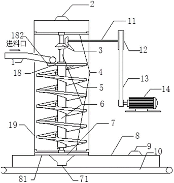 本实用新型涉及一种转体落料式的烧结矿转运站装置,包括运输系统、传动系统、除尘系统,所述的运输系统由上下层输送带、螺旋滑梯、装料斗、固定支架组成。传动系统由转动轴、传动轴、传动齿轮、飞轮、传动皮带、电动机组成。除尘系统由密闭罩、排风罩等除尘设备构成。螺旋滑梯为转运站落料的关键部件,由固定架固定在密闭罩上,其内部的转动轴与传动轴通过传动齿轮连接。传动轴末端的飞轮与电动机通过传动皮带连接。排料漏斗固定在螺旋滑梯正下方的落料口处的密闭罩上。本实用新型可以为转运站在落料时消除重力场因素对物料下落运动的影响,避免了下落颗粒流发生扩散运动,极大地减少了诱导风量和粉尘的产生,从而更加的节能环保。