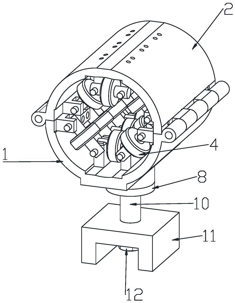 本实用新型涉及一种可换向导缆装置。其包括上外壳、下外壳、壳体,所述壳体置于活动连接的上外壳、下外壳内,所述壳体分为上下两瓣,所述壳体内侧安装有纵向导轮、横向导轮和斜导轮,所述纵向导轮、横向导轮和斜导轮构成贯穿的电缆通道,所述下外壳底部连有竖直方向且可转动的支架轴。该装置能防止电缆发生扭曲,打卷的情况发生,减少了人工的操作量,使线缆能够按照需要的轨迹运动。