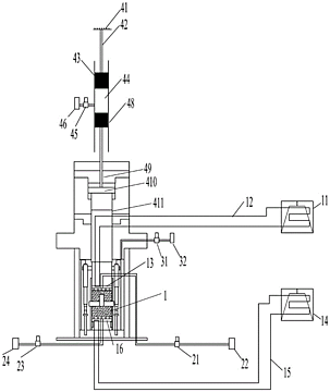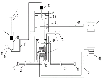 一种动荷载作用下岩石多场耦合流变试验测试装置,属于岩土试验设备领域。现有的动荷载作用下三轴流变试验装置对岩石试样施加的均为瞬间荷载,模拟的炸药爆炸产生的瞬间荷载,无法模拟炸药爆炸后产生的冲击波对岩石造成的影响,本实用新型技术方案为由电动机输出动力,曲柄将电动机的旋转运动转换为往复直线运动,动能推动缸体内活塞A将机械能转换为液压能,转换的液压能推动活塞B,与活塞B表面传力杆连接的加载板持续对岩石试样施加动荷载;本实用新型提供的动荷载作用下岩石多场耦合流变试验测试装置可以给岩石试样施加持续动荷载,模拟工况中爆炸产生的冲击波对岩石的影响。
