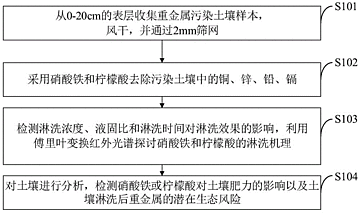 本发明属于重金属污染土壤修复技术领域,公开了一种土壤重金属淋洗剂、重金属污染土壤的淋洗方法及应用,土壤重金属淋洗剂为硝酸铁和柠檬酸;收集重金属污染土壤样本,风干,并过筛;采用硝酸铁和柠檬酸去除污染土壤中的Cu、Zn、Pb和Cd;检测淋洗浓度、固液比和淋洗时间对淋洗效果的影响,利用傅里叶变换红外光谱确定硝酸铁和柠檬酸的淋洗机理;对土壤进行分析,检测硝酸铁或柠檬酸对土壤肥力的影响以及土壤淋洗后重金属的潜在生态风险。本发明可以为利用硝酸铁作为一种有效的土壤重金属淋洗剂的潜力提供见解,减少重金属对环境和人体健康危害的关键是选择合适的淋洗剂对重金属污染土壤进行修复。