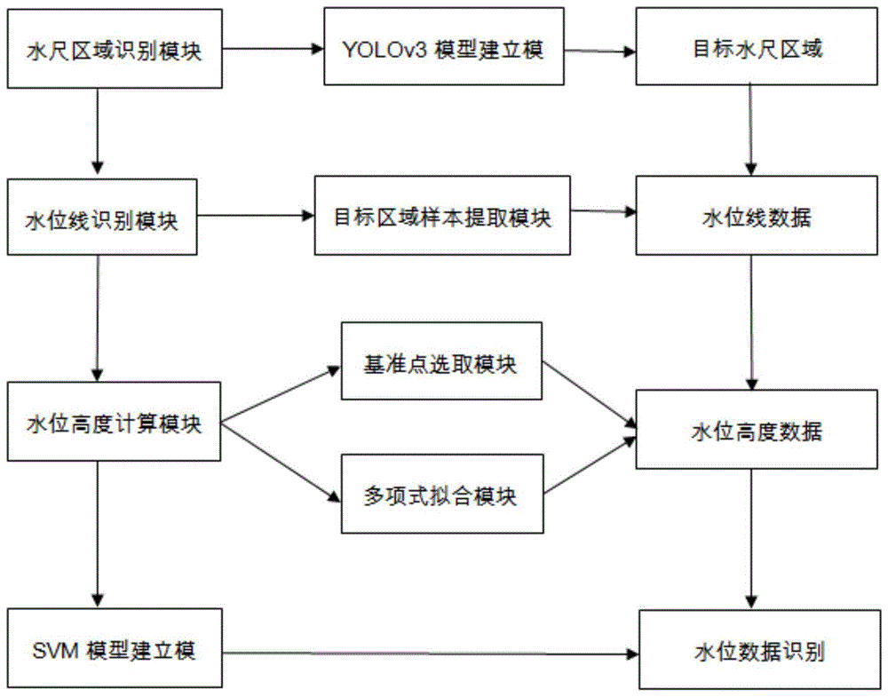 本发明涉及一种基于YOLOv3的水位识别方法,包括:获取多气象全时段水尺图像数据集;使用所述数据集对已有YOLOv3模型的权重进行预训练,得到基于YOLOv3网络的水尺区域识别预训练模型;利用所述水尺区域识别预训练模型对待检测水尺图像进行预测,获取感兴趣水尺区域;使用误差校正算法对所述感兴趣水尺区域进行校正,得到包含水尺和水面的待识别区域;利用SVM算法建立水位线识别模型;利用三次多项式拟合得出像素和对应长度的线性拟合参数;基于所述线性拟合参数映射基准点到水位线位置的像素长度得到实际水位距离水尺顶点的长度,将水尺高程顶点长度减去该长度得到实际水位值。本发明具有在极端恶劣天气条件下提高水位识别的准确性和抗干扰性的特点。